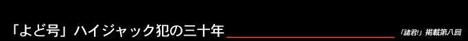 ハイジャック犯の三十年 日航機「よど号」がハイジャックされてから三十年が過ぎた。九人の日本赤軍の若者たちが日本刀を振りかざして北朝鮮へ不法侵入し、亡命した事件である。彼らのうち何人かは以後北朝鮮に滞在したままで今日に至るが、昨今、彼らの子供たちの「人道帰国」問題がマスコミに登場している。人の情けとしては、「子供たちだけは、何とか帰国させたいんや」ということも理解できるが、「二世代にわたる革命の尖兵にする。」という見方も根強く囁かれている。